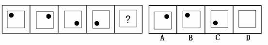 (答案:B。黑点在正方形中顺时针移动。在第5个图形中,应该正好移动到左上角。)