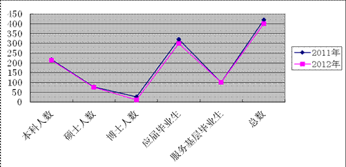213人、硕士76人、博士11人),服务农村基层高校毕业生100人。较2011年招录总量420人略有下降,其中本科生名额下调4人,硕士下调1人,博士下调15人。但硕士与博士所占比例依然较高,而且服务农村基层高校毕业生招录人数依然保持在100人。可见,虽然2012年招录人数有所下降,但依然延续了对高学历人才和服务农村基层高校毕业生的倾斜。