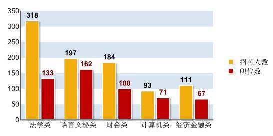 从本次招录有226个职位共招录806人不限专业,招录职位占总职位数的24%,招录人数占总人数的42%。中公教育对本次考试较为受青睐的五大热门专业做了招考人数和职位的统计供考生参考: