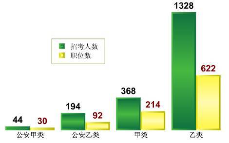 本次考试共有714个乙类职位(包括公安),占总职位数的75%,共招录1522人。剩下244个为甲类职位(包括公安)。中公教育专家要提醒大家的是,甲类职位的笔试公共科目为《行政职业能力测验》和《申论》,乙类职位的笔试公共科目为《行政职业能力测验》。因此,广大考生要看准考试科目,准确备考。另外,全省公安机关(含森林公安)人民警察的职位还需进行《公安基础知识》的专业科目考试。