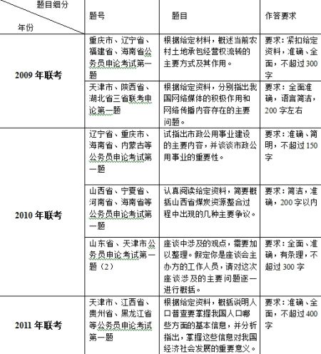 从以上题型可以看出,每年的联考概括题型出现的频率是比较高的,并且无一例外都是出现在申论作答要求的第一题。另外,在所有的概括题中,无一例外都是要求考生的答案是全面、准确、简洁的,这一要求其实给我们考生提供了很多信息点:首先,考生答案的信息点必须很全面,能反映材料中所有的信息;其次,要准确,找准靶心。不需要作答的就不答,答原因类的题目就不能需要答现状,答意义类就不需要对策;最后,简洁其实反映了字数的内在要求。考生如果想把自己的信息点答全,那么在有限的字数范围内,简洁就是必须的了。