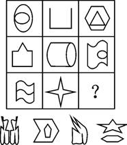 解析:样式类。这个题目比较有新意。一般样式类的题目,都是三个图形一组,分成两组,一组是题干,一组是选项。而这个题目直接将两组图形融合成一个整体。万变不离其宗,这个题目运用的是递推数列的推理思路。就是前面的两个图形进行去同存异得到第三个图形。以此规律,故正确答案选择A。