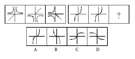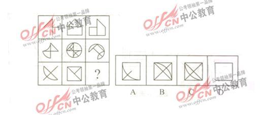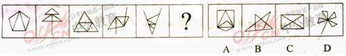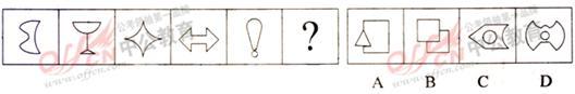 思路分析:这是一道较简单,但很多考生仍然不能拿到分的题目。咋一看,题干的各个图形没有共同特点,相互之间也没任何关系,但仔细分析每个图形,我们可发现每个图形都有对称性。第三个图形和第四个图形既有竖直对称轴、又有水平对称轴;第二个图形和第五个图形都只有竖直对称轴;第一个图形和第六个图形都只有水平对称轴。选项中只有C有水平对称轴。