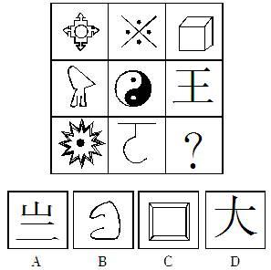 解题思路:定位此题为线条所组成的图形变化,故思维圈定于图形的笔画数;图形的对称性;图形求同。