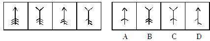 解题思路:此题为细节变化问题,故思维圈定为前后图对比寻找细节差异。第一图与第二图比较可发现,箭头方向发生变化、左边的小线段从最下面减少一条,对比第二图与第三图,箭头方向又发生变化、右边的小线段从最上面减少一条,即可推得可能性规律,以第三、四幅图进行验证,符合,对照选项,可得题解为D。