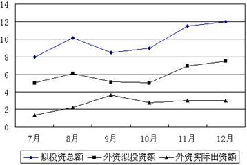 【京佳解析】D 2006年第四季度的3个月的外资实际出资额都在3亿元左右,所以总计约达9亿元,Ⅰ正确;该市拟投资总额在2006年10月份上旬为下半年最低,Ⅱ错误;通过看图,可以直接观察到Ⅲ是正确的。故选D。