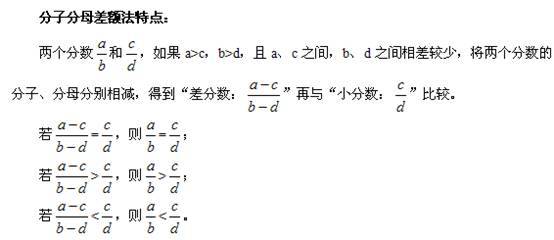 分子分母差额法是指通过两个分数的分子、分母作差之后的值与原来分数对比来判断分数大小的方法。