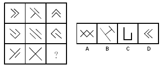 中公解析:题干图形都由简单线条构成,每行三个图形之间都有一些位置相同的线条,仔细对比分析发现,每行前一个图形变动其中一条线的位置,即得到下一个图形。选项中只有B能通过移动第二个图形中的一条线后得到。本题选B。