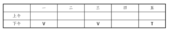 中公解析:此题涉及人物和时间两类元素,且每天又分为上午和下午,列表可以更清晰地表示出每个人的接待时间。根据(3)、(4)和“T只在星期五被安排做接待工作”可列表如下: