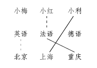 由图可知,小红不来自重庆,又小利来自上海,因此小红来自北京,学德语。则小梅来自重庆,学法语。所以,小利来自上海,学英语。故答案选B。