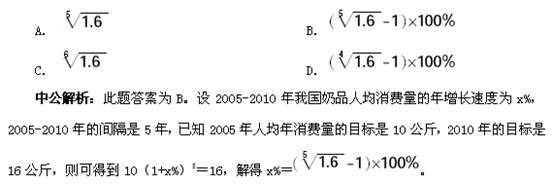 按照《“十五”营养发展纲要》提出的中国奶品消费的目标,2005-2010年我国奶品人均消费量的年增长速度将为(假设每年以相同速度增长)( )。