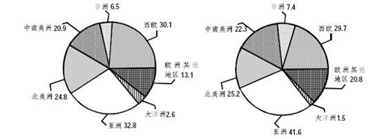 中公解析:此题答案为A。方法一,图中出现了北美洲和中南美洲,题干中的美洲应包括这两个地区。直观观察,可以发现从1998年到2004年代表美洲地区啤酒销售量的扇形变小了,即美洲地区啤酒销售量占世界啤酒消费总量比重下降了,下降的百分比可以利用量角器测量角度来进行计算,依此估算出该比重下降约3个百分点。