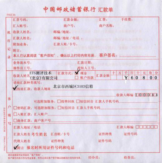 在备注处:留下证件号码和有效联系电话。 请考生注意: 您通过邮局汇款时,不要使用加密方式。. 如果因考生使用加密方式造成汇款丢失,我们不负其相关责任。.