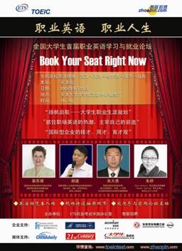 本次活动将围绕“职业英语学习”和“职业生涯发展”两大话题,为即将走向工作岗位的大学生提供宝贵信息与建议。届时,原ETS总部托业项目总监、托福命题总监、亚太市场总监秦苏珊女士,智联招聘资深职业发展顾问,以及来自埃森哲中国、南方航空、东方汽车的知名企业代表将发表演讲和参与座谈,就“职业英语学习与应用”、“提升国际化职场竞争力”、“国际型企业择才、用才和育才观”等热点话题与大学生们进行坦率的面对面交流。
