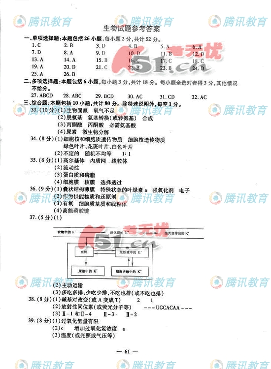 2007年普通高等学校招生统一考试江苏生物卷答案