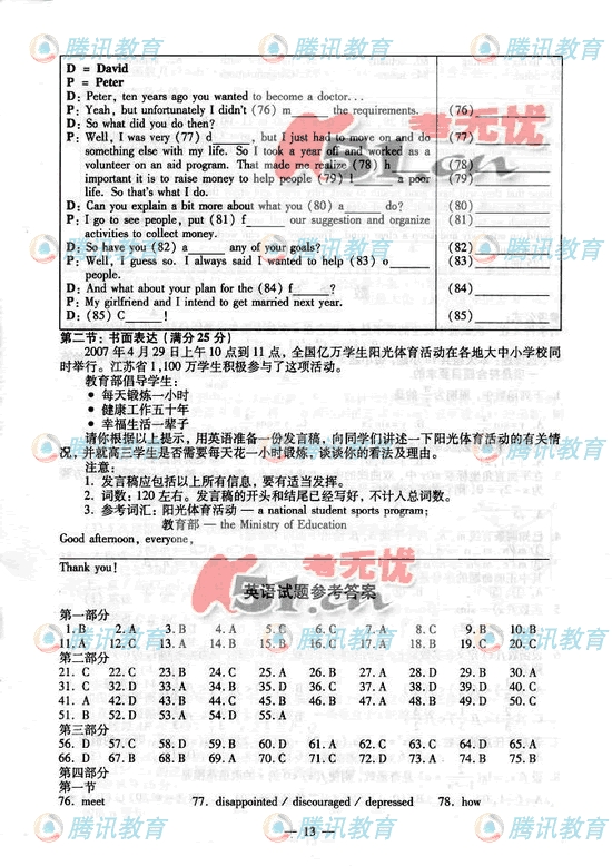 2007年普通高等学校招生统一考试江苏英语卷答案