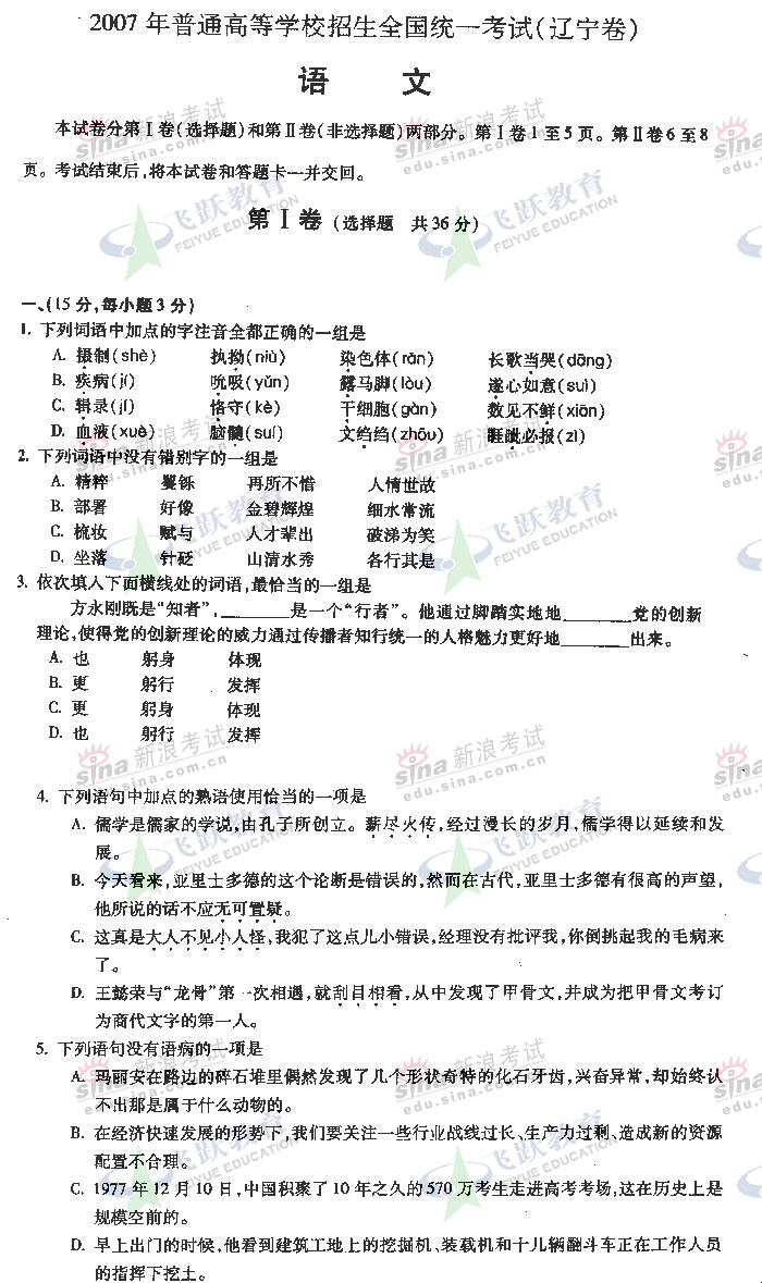 2007年高等学校全国统一考试语文试题(辽宁卷)