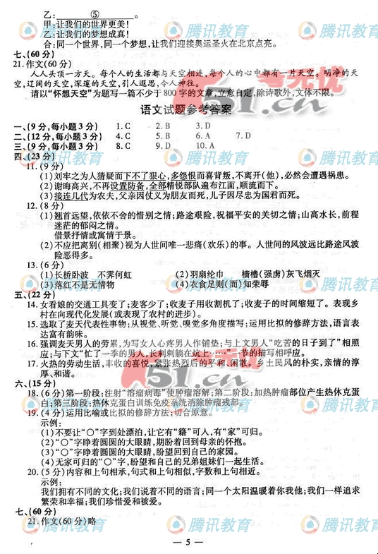 2007年普通高等学校招生统一考试江苏语文卷答案